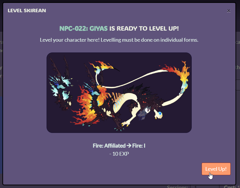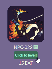Click to level will take you to a page where you confirm your level up! If your character has one form it will ask you to confirm by clicking Level Up! If your character has multiple forms that can be levelled you may select a form and then the EXP will be deducted. EXP rolls over! Meaning if you had 23 EXP but only needed 20, you would have 3 leftover.